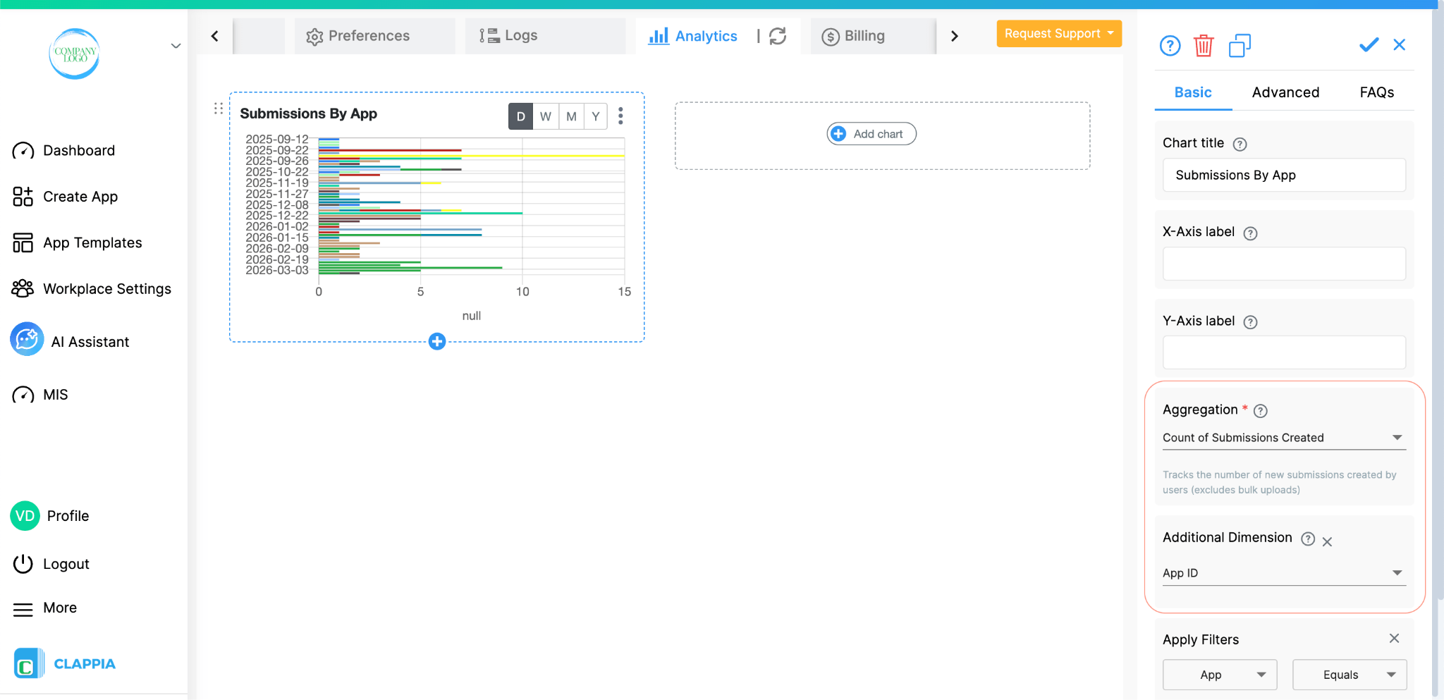These count submissions created in apps within the workplace. You can see the total number of submissions across all apps, or limit the count to submissions from specific apps or submissions created by specific users using the chart filters.