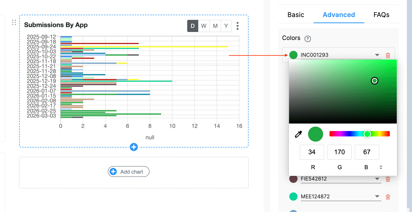 Note: The Colors option only becomes usable after you have configured the chart on the Basic tab and saved it at least once. If you are setting up a new chart, complete the Basic tab configuration, save the chart, and then re-open it to access the Advanced tab and configure colours.