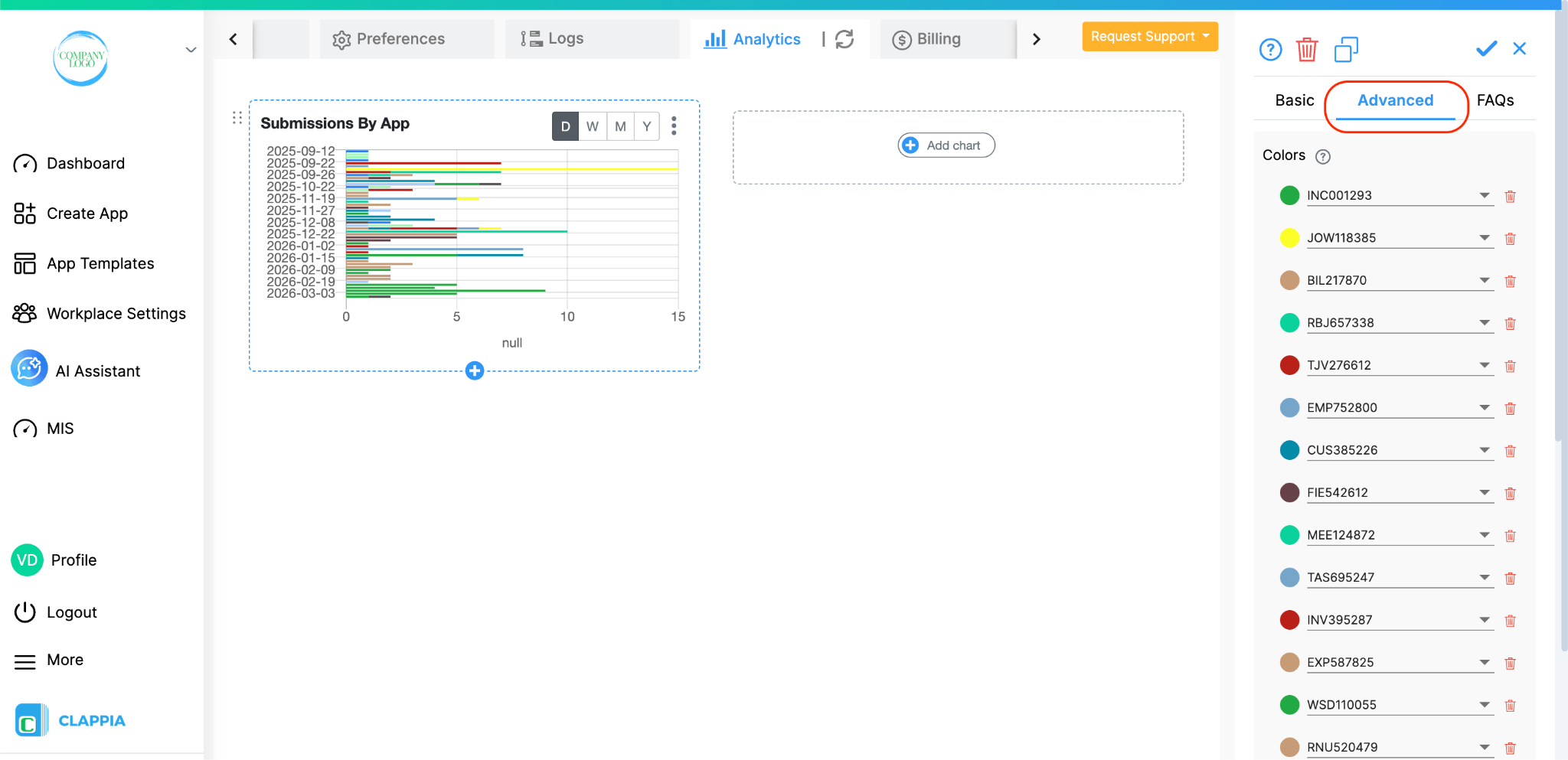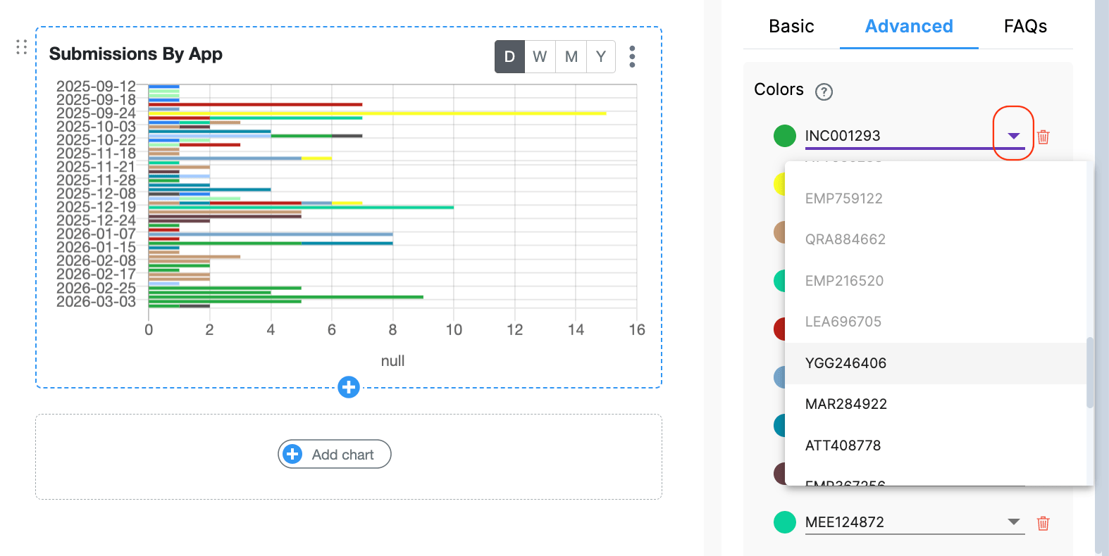 The Colors option under the Advanced tab allows you to override the default colours assigned to labels in your chart. This is useful when you want consistent colour coding across charts, for example, always showing a specific app or status in a particular colour.