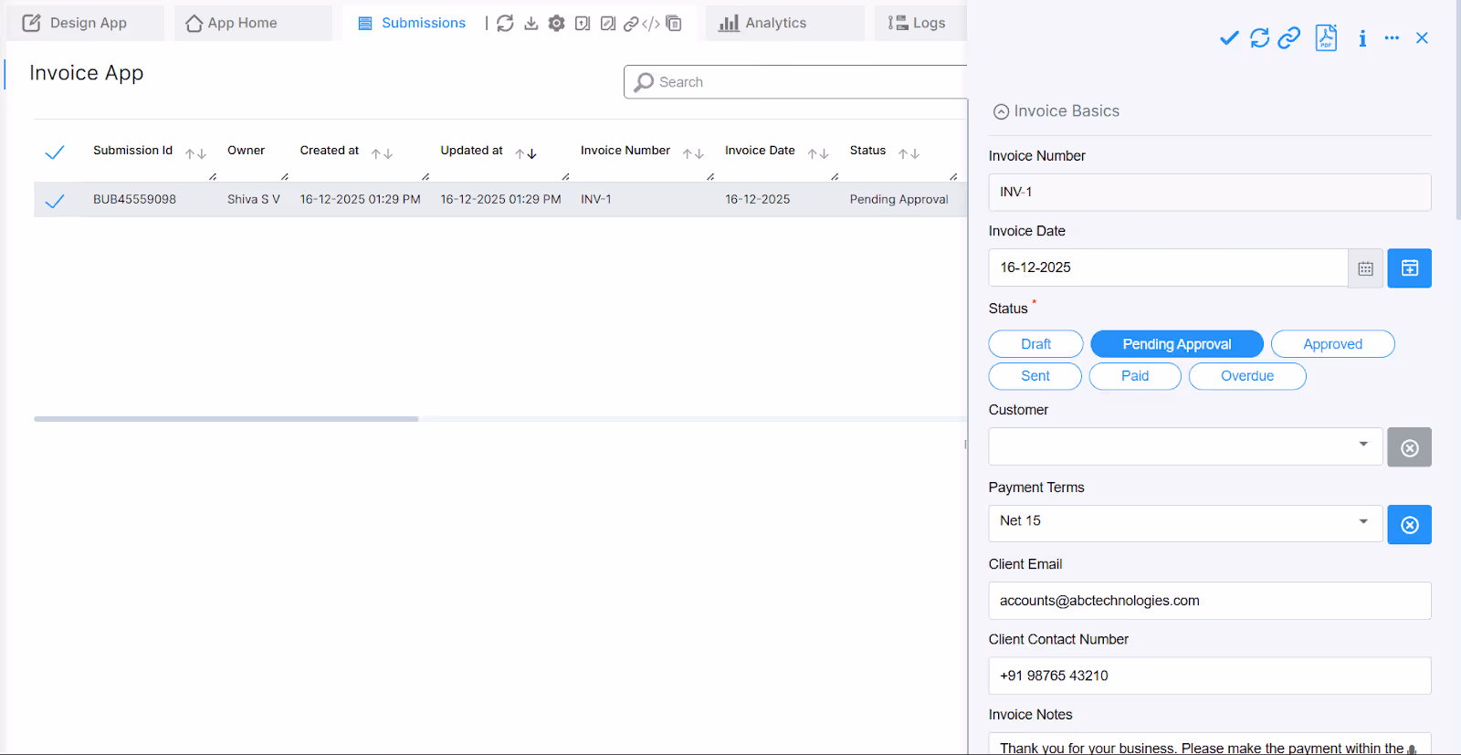 Create multi-level approval workflows where invoices route automatically to managers for review before sending to clients. Clappia's workflow system sends email notifications when invoices are created, approved, sent, viewed by clients, paid, or overdue.