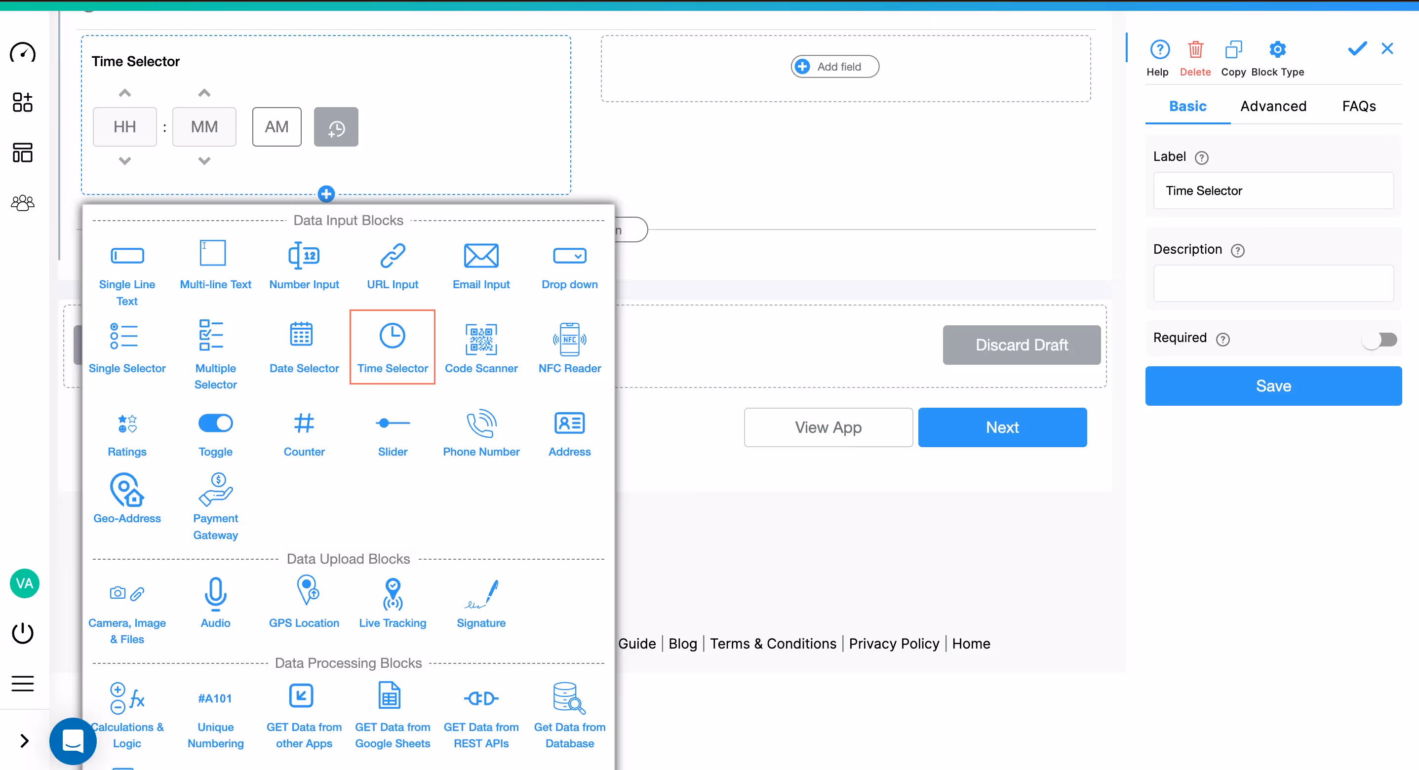 Clappia's App Designer Blocks include a variety of blocks for data input, upload, and processing, such as the Time Selector block. These blocks offer options for adding workflows, incorporating analytics, and integrating with external APIs.
