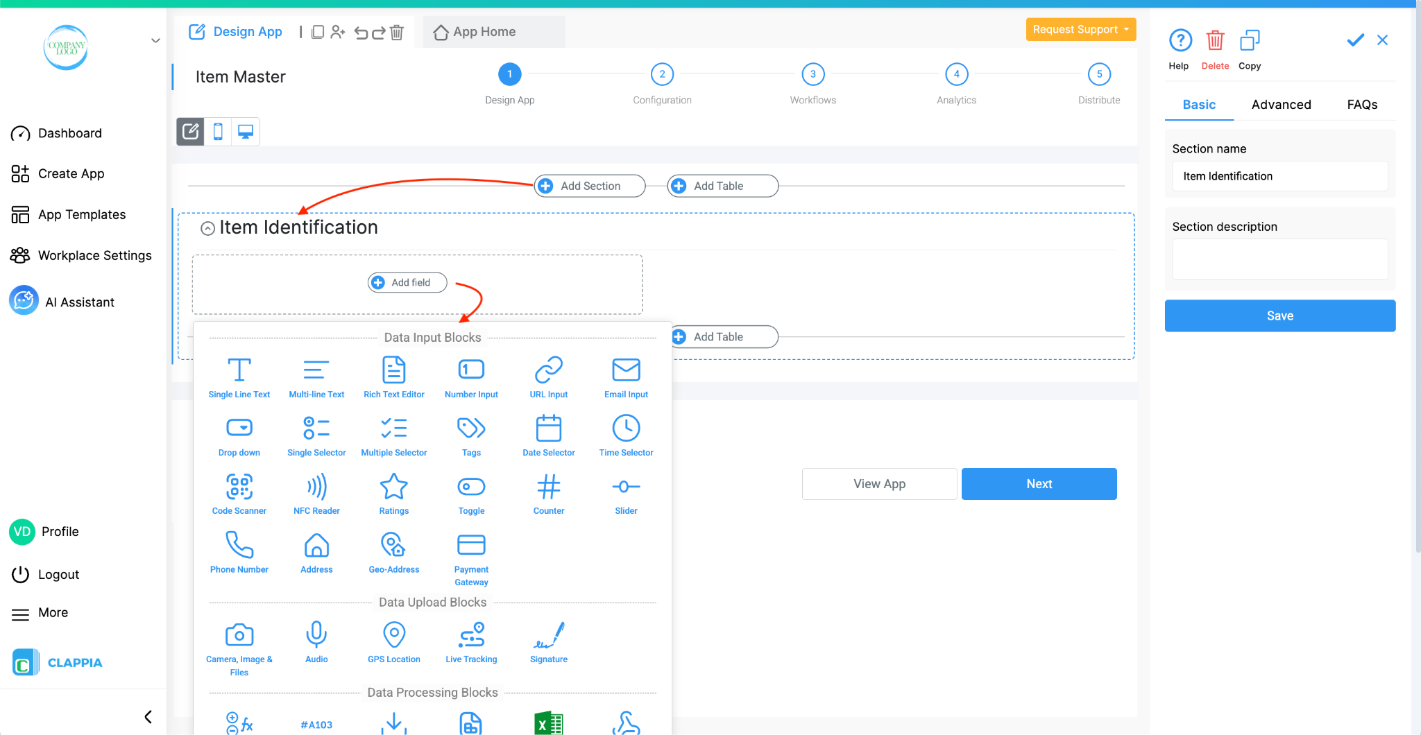 From your Clappia dashboard, click Create App. Go to Design App and name it "Item Master".