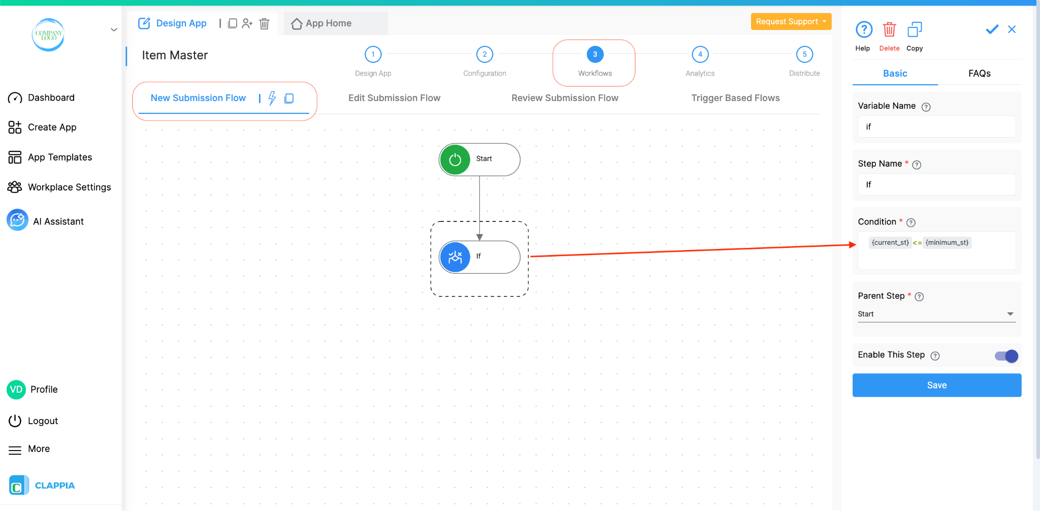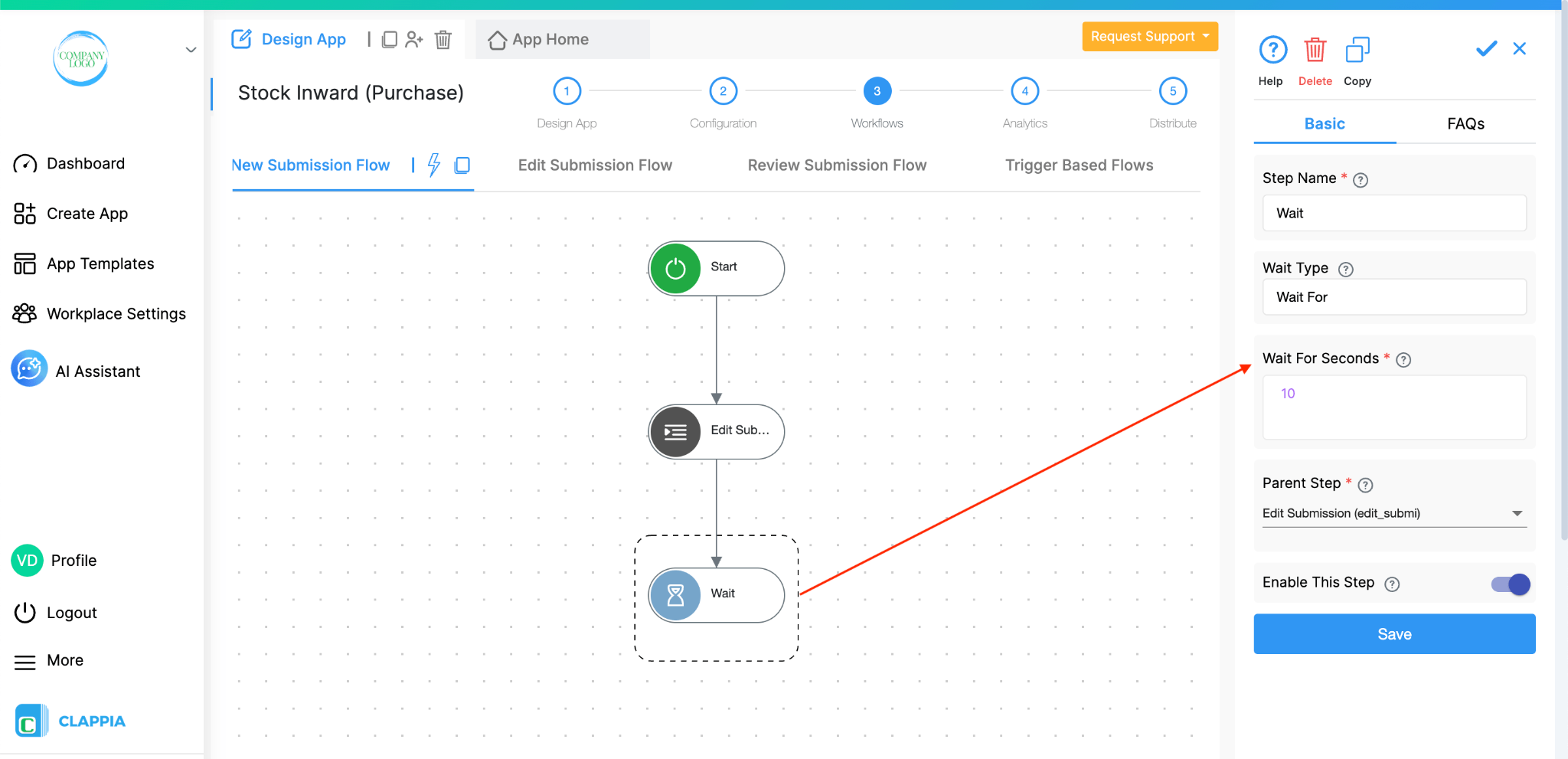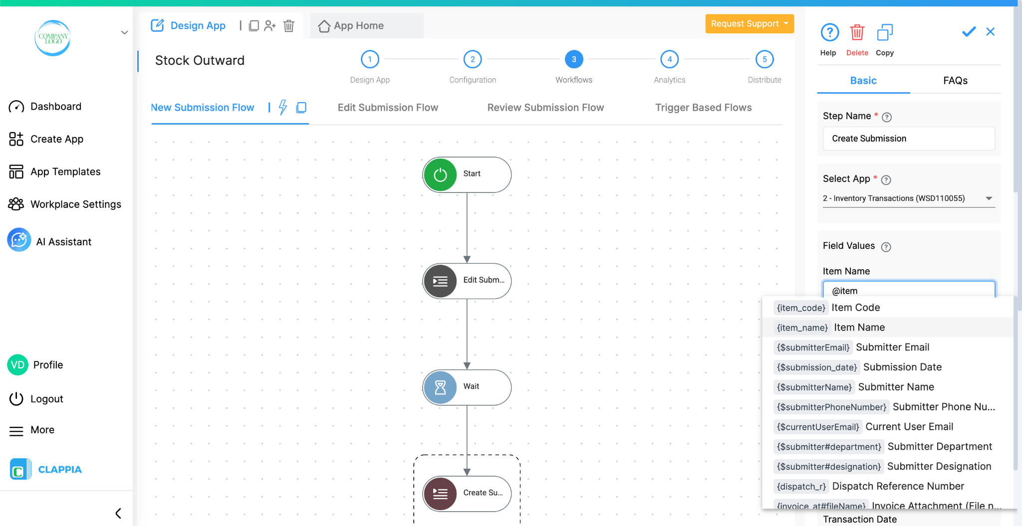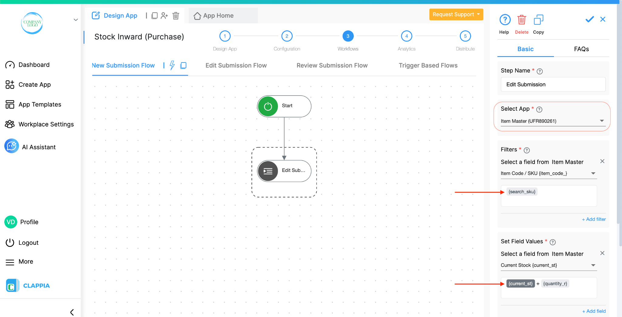 Once the app is set up, go to Design App > Workflows and select the Edit Submission Flow. This workflow will run every time a stock level is updated, which happens when the Inward or Outward apps submit entries.
