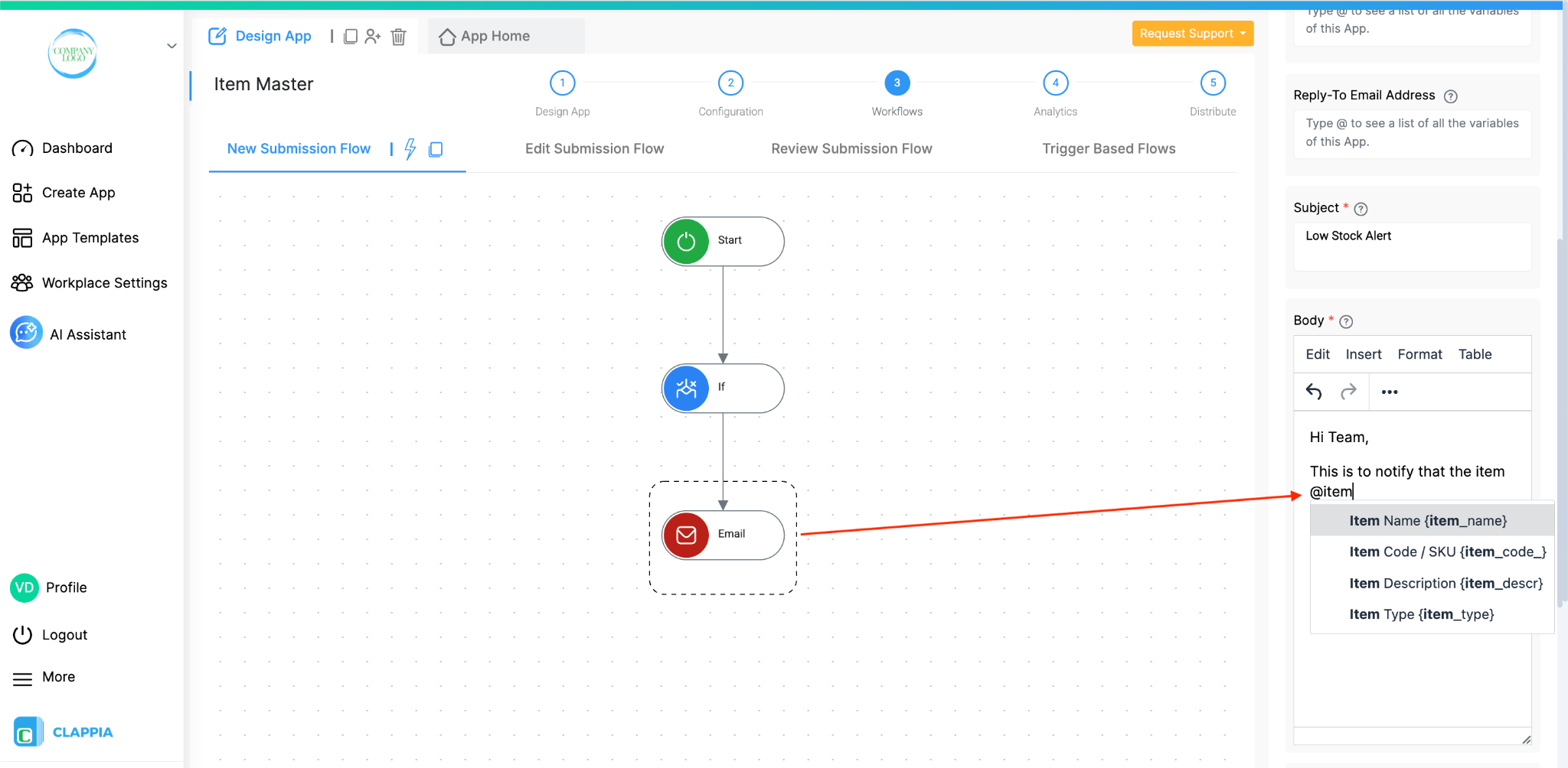 Next, add an Email step below the IF workflow step to notify your inventory manager or other relevant team. You can include relevant details in the email body such as the item name, item code, current stock, and minimum stock level using field variables (type @ to insert them).