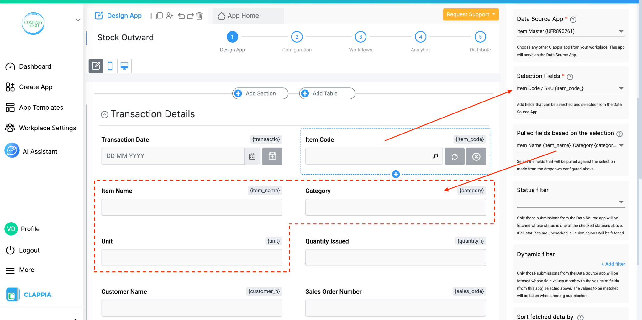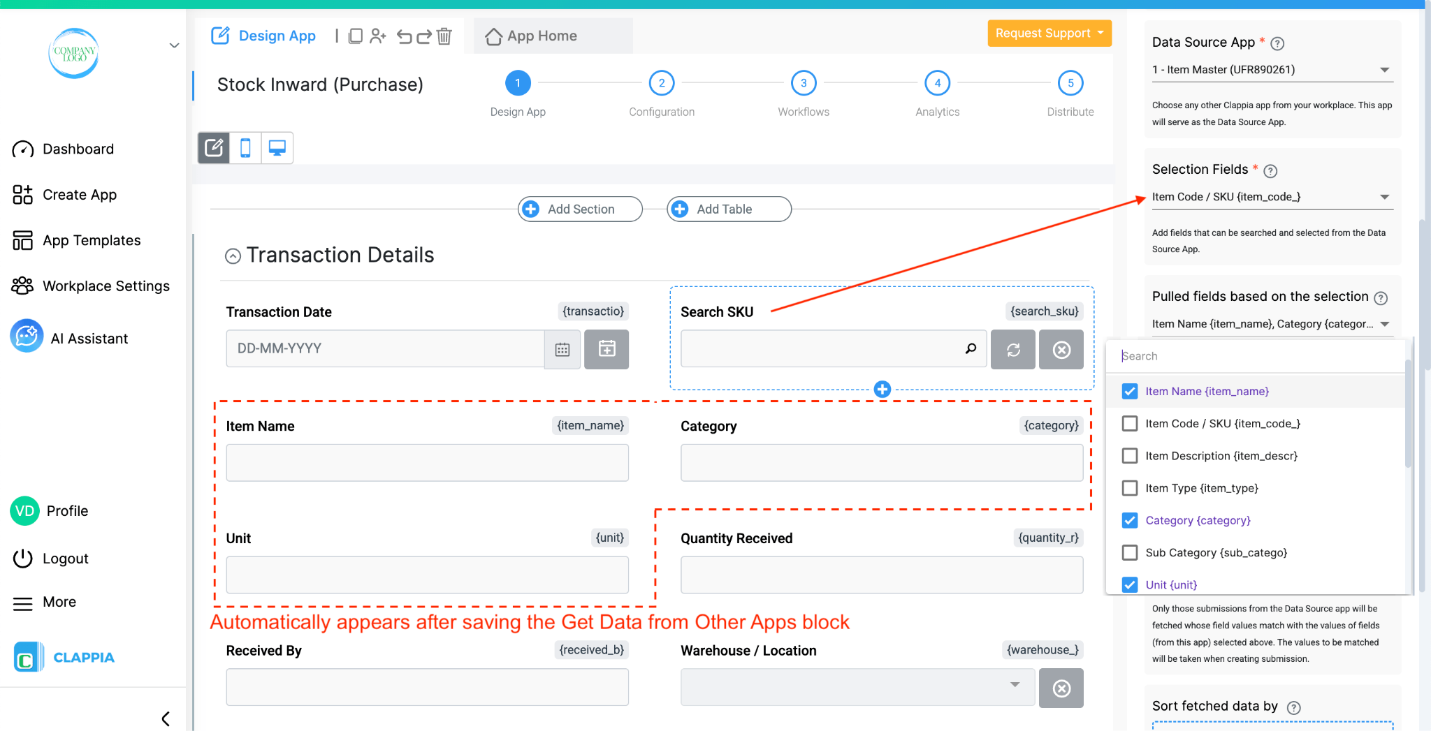 For the Item Code field, add a Get Data from Other Apps block and link it to the Item Master. Set Item Code / SKU as the search column. Set Category and Unit as the pulled columns. This way, when a user selects or types the item code while filling in the app, the category and unit fields fill in automatically from the Item Master record, no manual re-entry needed.