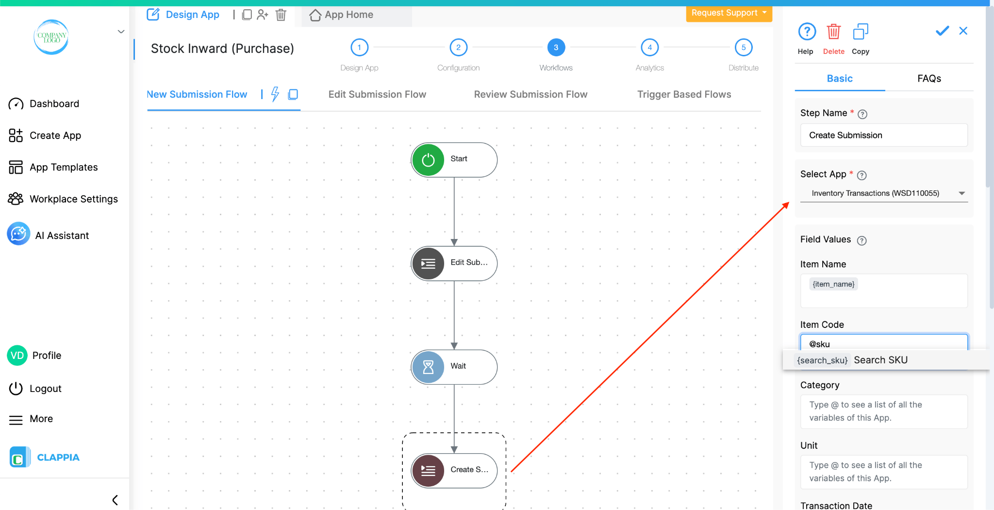 In the same New Submission Flow, add another step after the Edit Submission step. Select Create Submission and set the target app as Inventory Transactions.